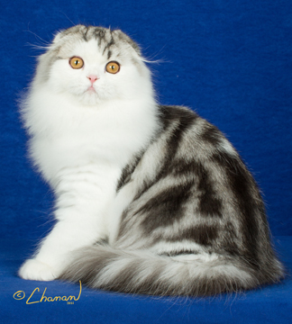 Stevie is a long-hair silver classic tabby and white boy. He was always the largest kitten in the litter. Stevie is a perfect example of what the Scottish Fold should look like...wide expressive eyes, tightly folded ears, solid stocky body and a broad, round head. On top of all this, Stevie is a kind and gentle boy who is proving to be a perfect big brother to Jasmina. He has learned to give Bonnie lots of space, and MacGregor keeps an eye on all the antics. Stevie's human dad Morley takes lots of photographs. Here are some more pics of Stevie, his feline housemates, as well birds and flowers.
